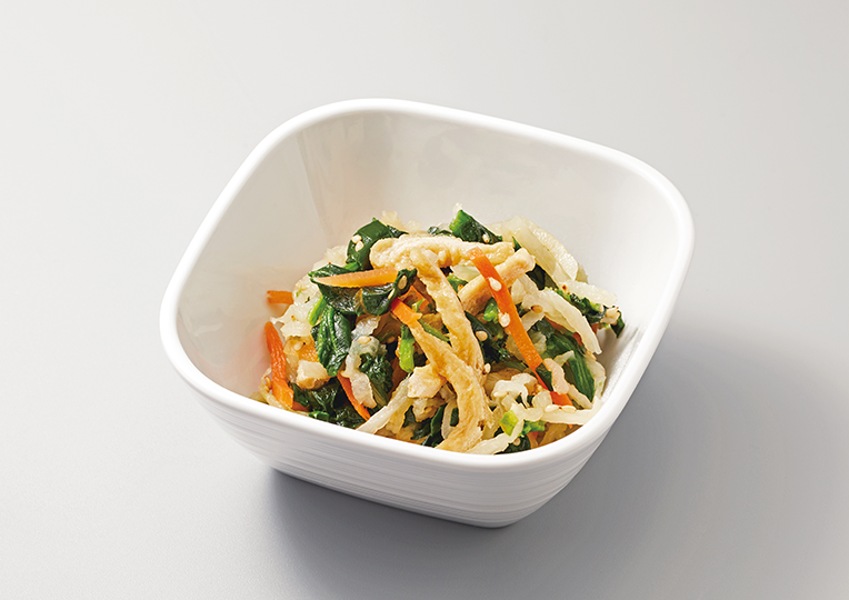 Boiled spinach with sesame and simmered dried radish strips tossed in Japanese soup